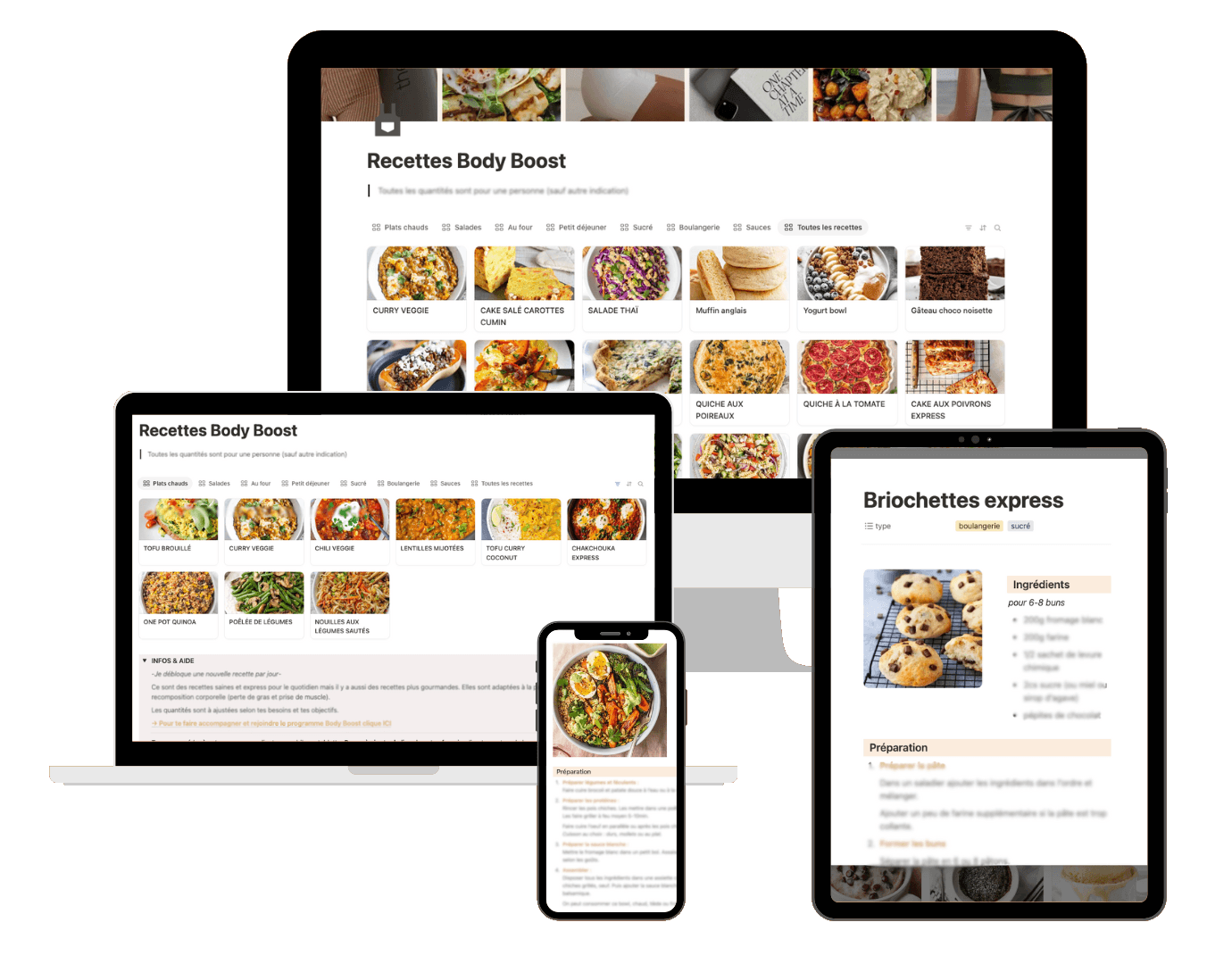 Planning des repas, recettes équilibrées, guide courses. Programme sportif maison tous niveaux. Rituels anti-stress, exercices de journaling, et bien plus.